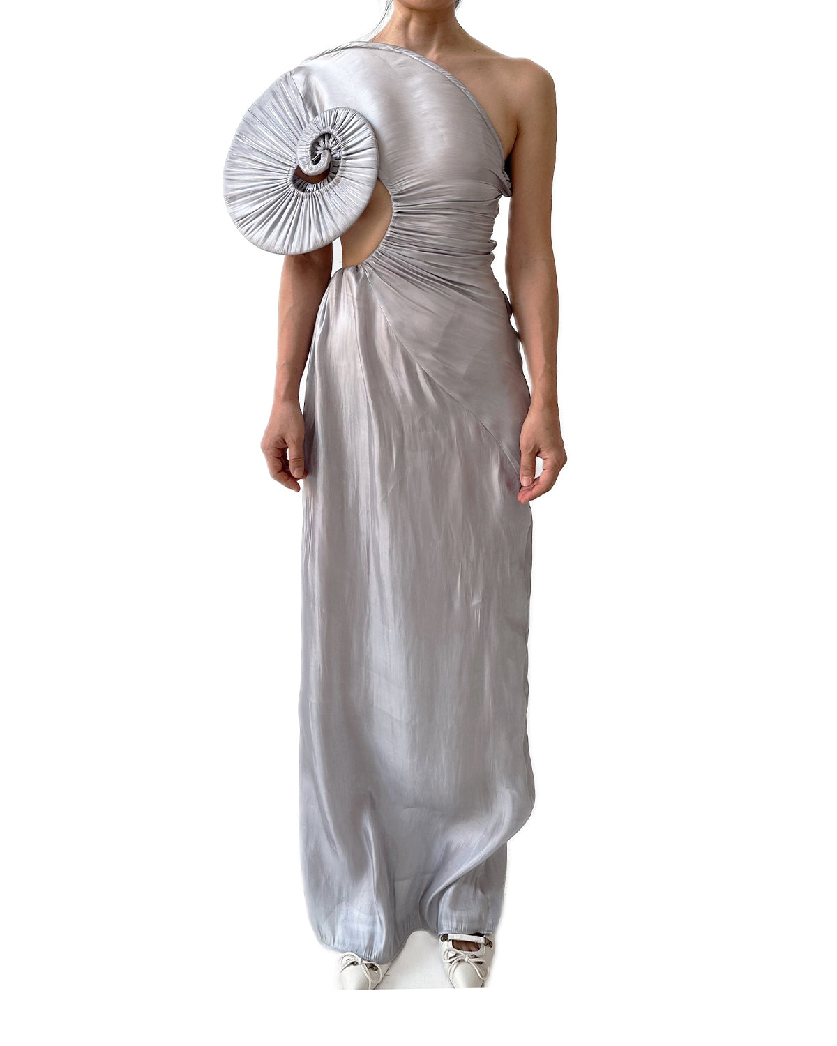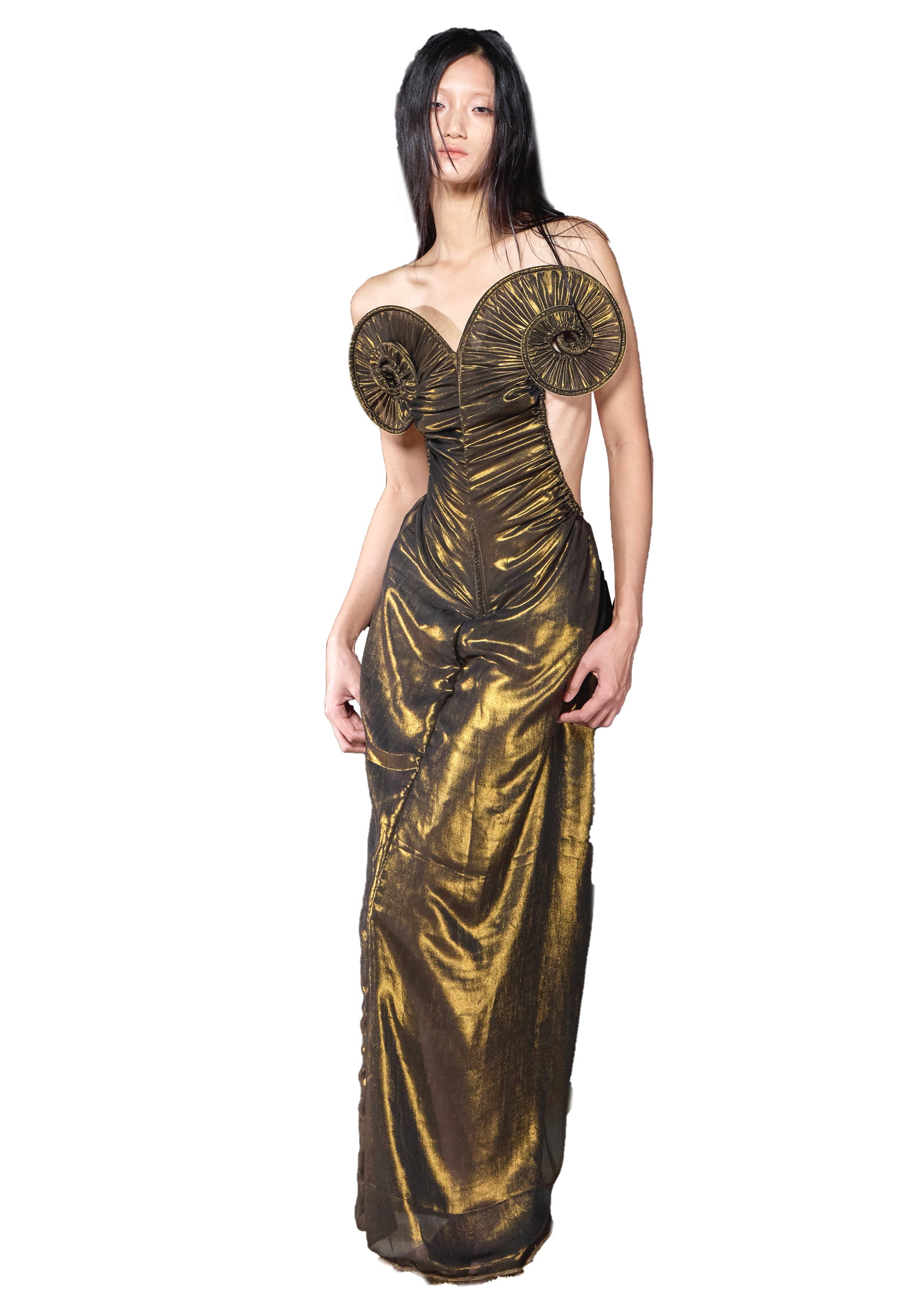 Draped Sea Shell Swirl Maxi Gown Glossy Gold