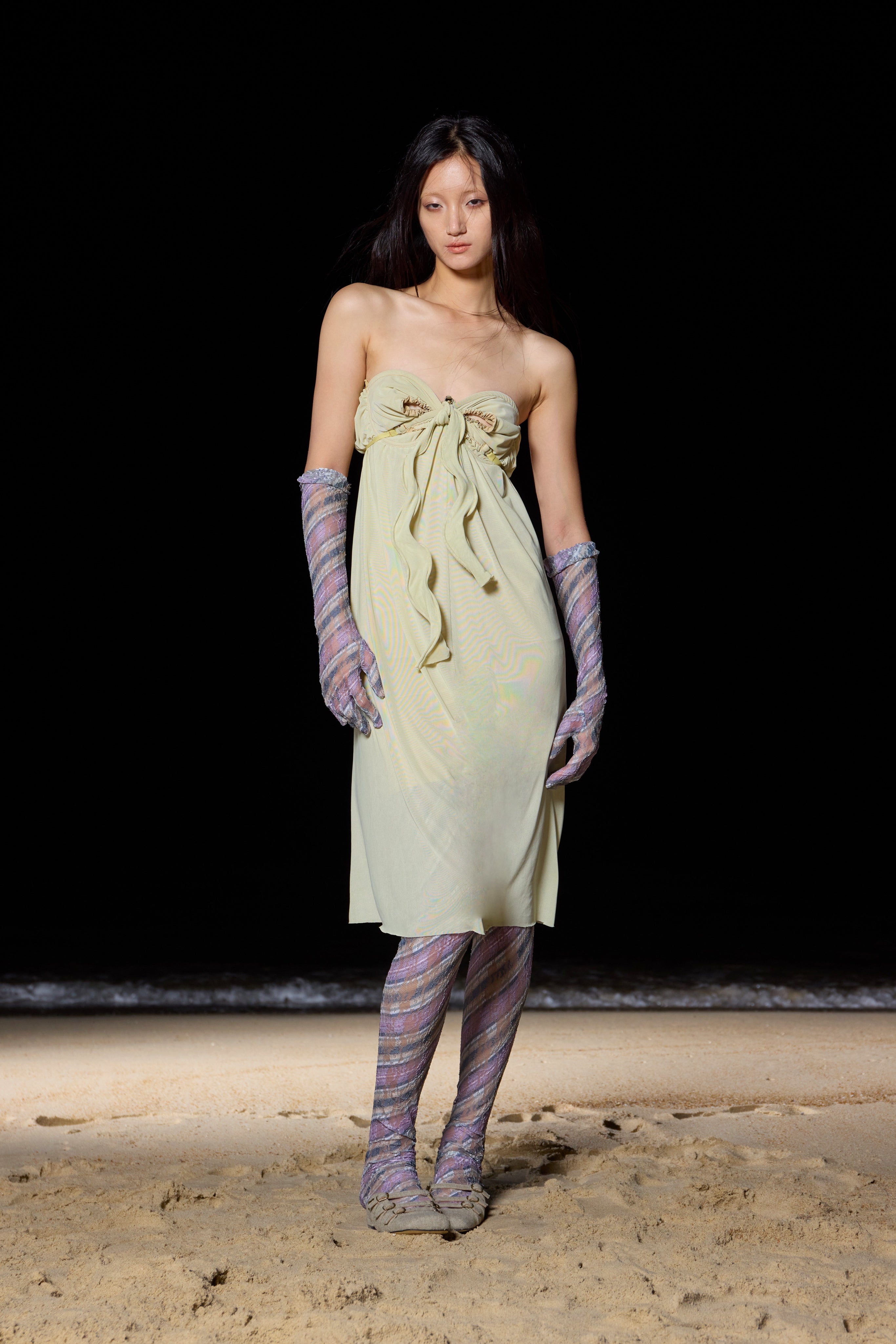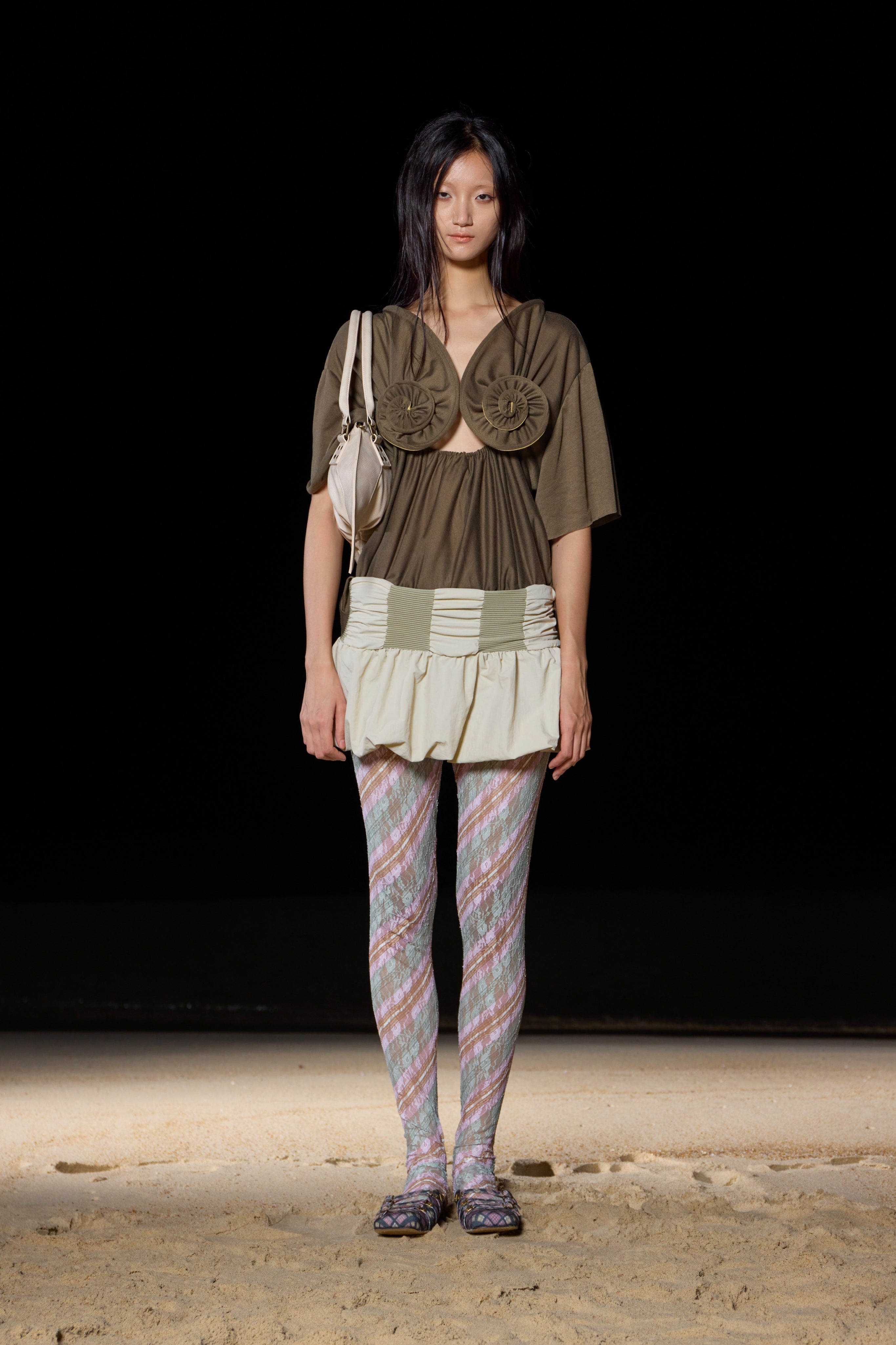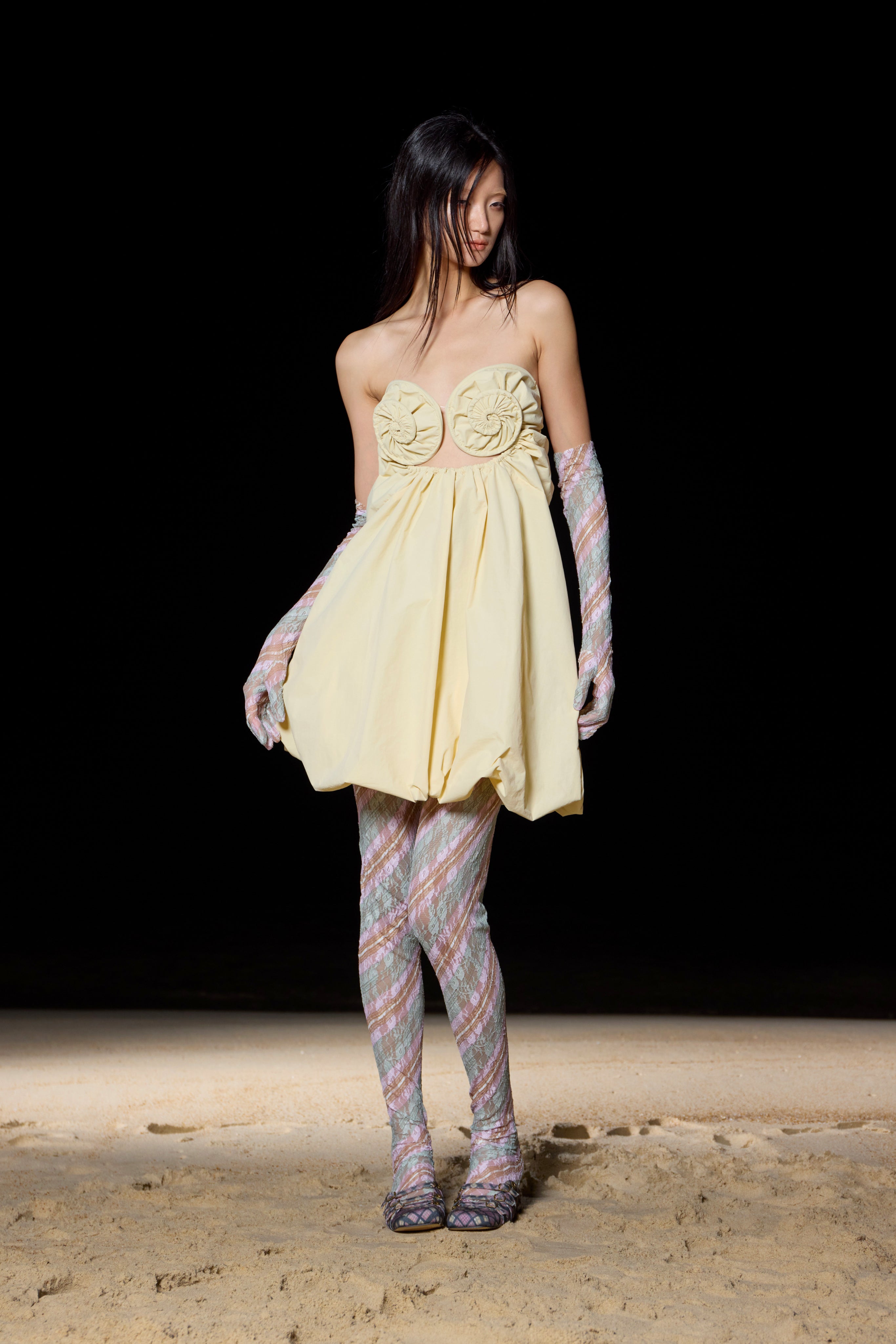 Building upon Yitao's signature style, this collection continues to celebrate the playful and vibrant nature of fashion. The designer's iconic lace textiles are once again reimagined, this time mixed with engineered, innovative pattern experiments that push the boundaries of traditional design. The introduction of stripes and ribs adds a fresh element to the collection, yet stays true to taottao’s unique approach—creating statement pieces that speak with a subtle loudness.