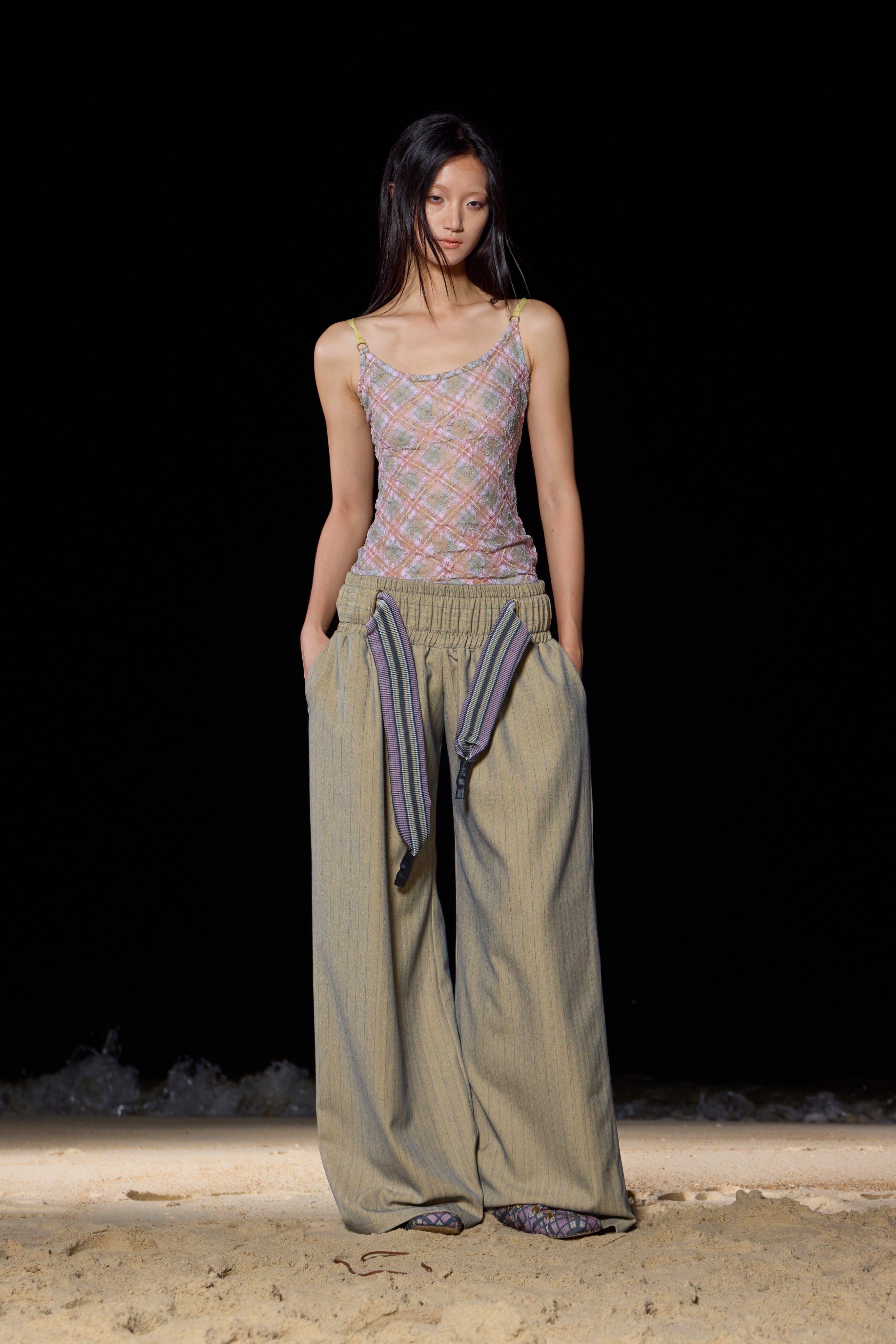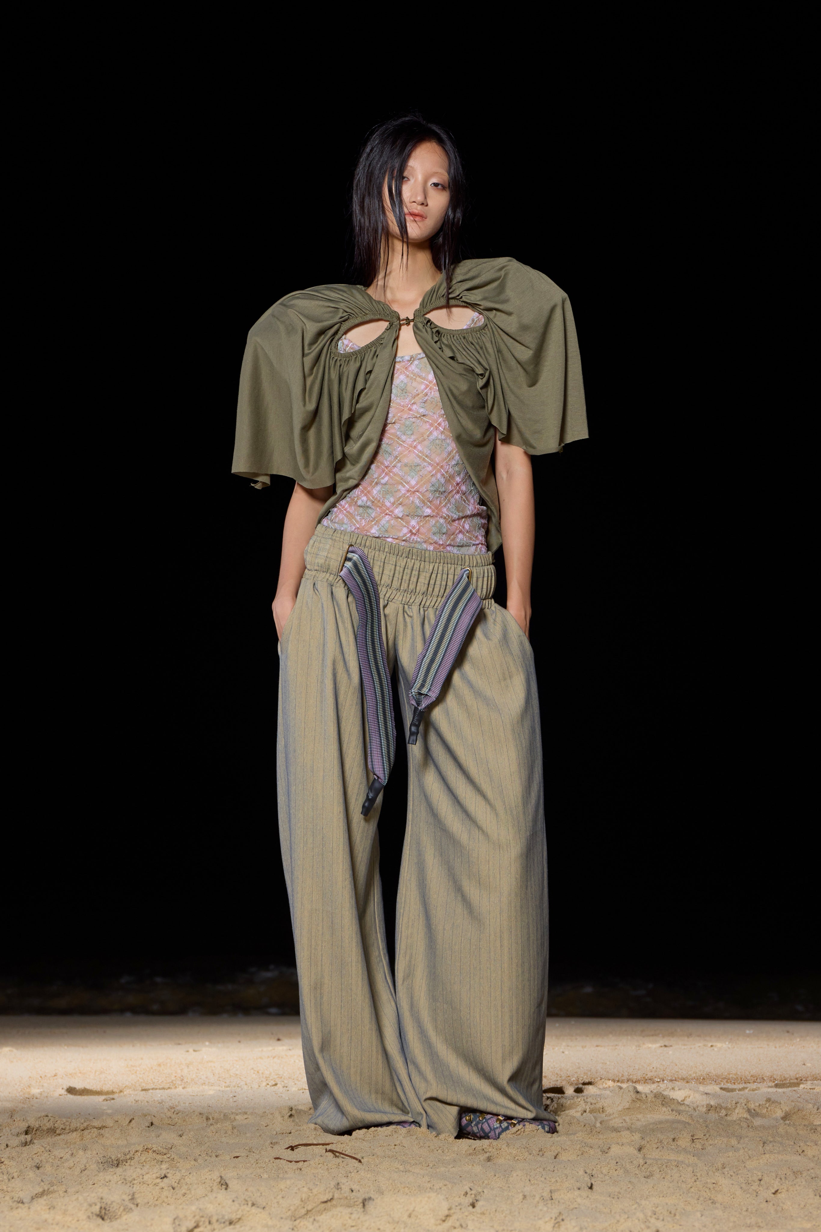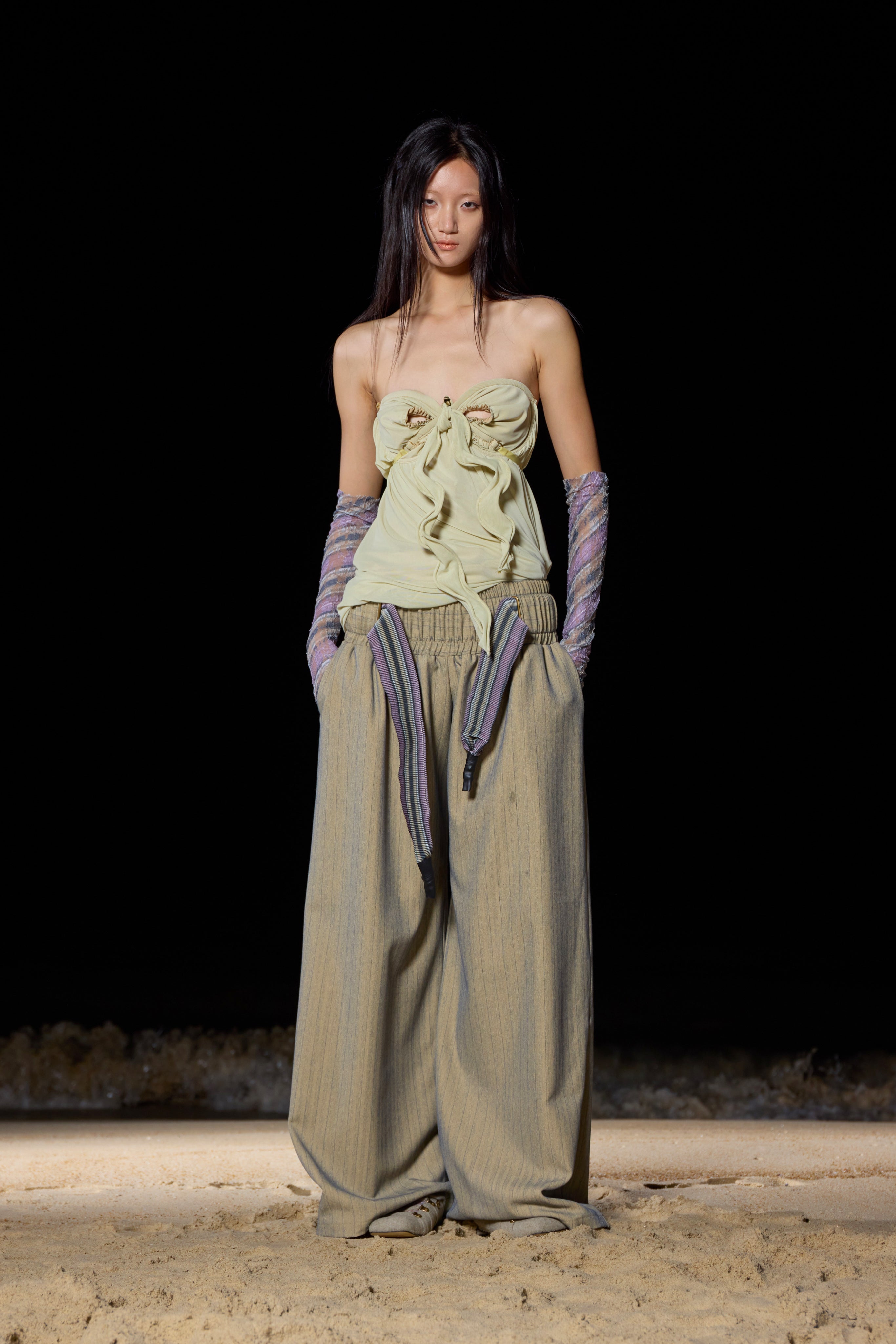 Building upon Yitao's signature style, this collection continues to celebrate the playful and vibrant nature of fashion. The designer's iconic lace textiles are once again reimagined, this time mixed with engineered, innovative pattern experiments that push the boundaries of traditional design. The introduction of stripes and ribs adds a fresh element to the collection, yet stays true to taottao’s unique approach—creating statement pieces that speak with a subtle loudness.